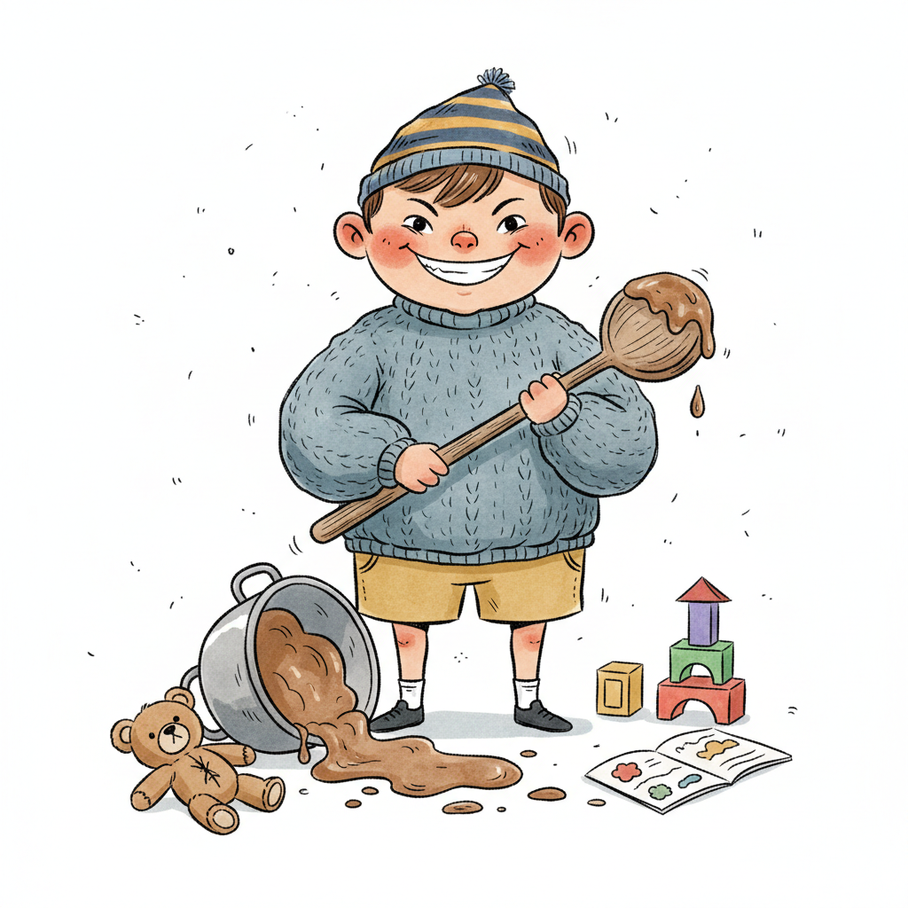 Frecher Junge mit Schlamm auf Löffel, umgekipptem Topf und verstreutem Spielzeug am Boden.