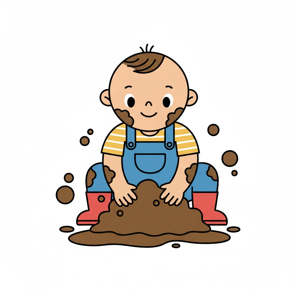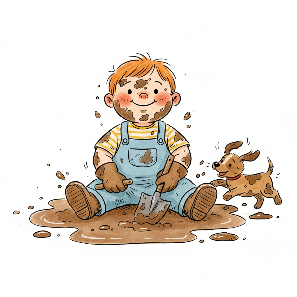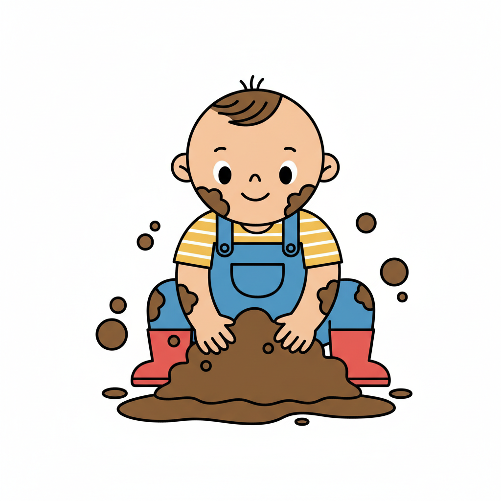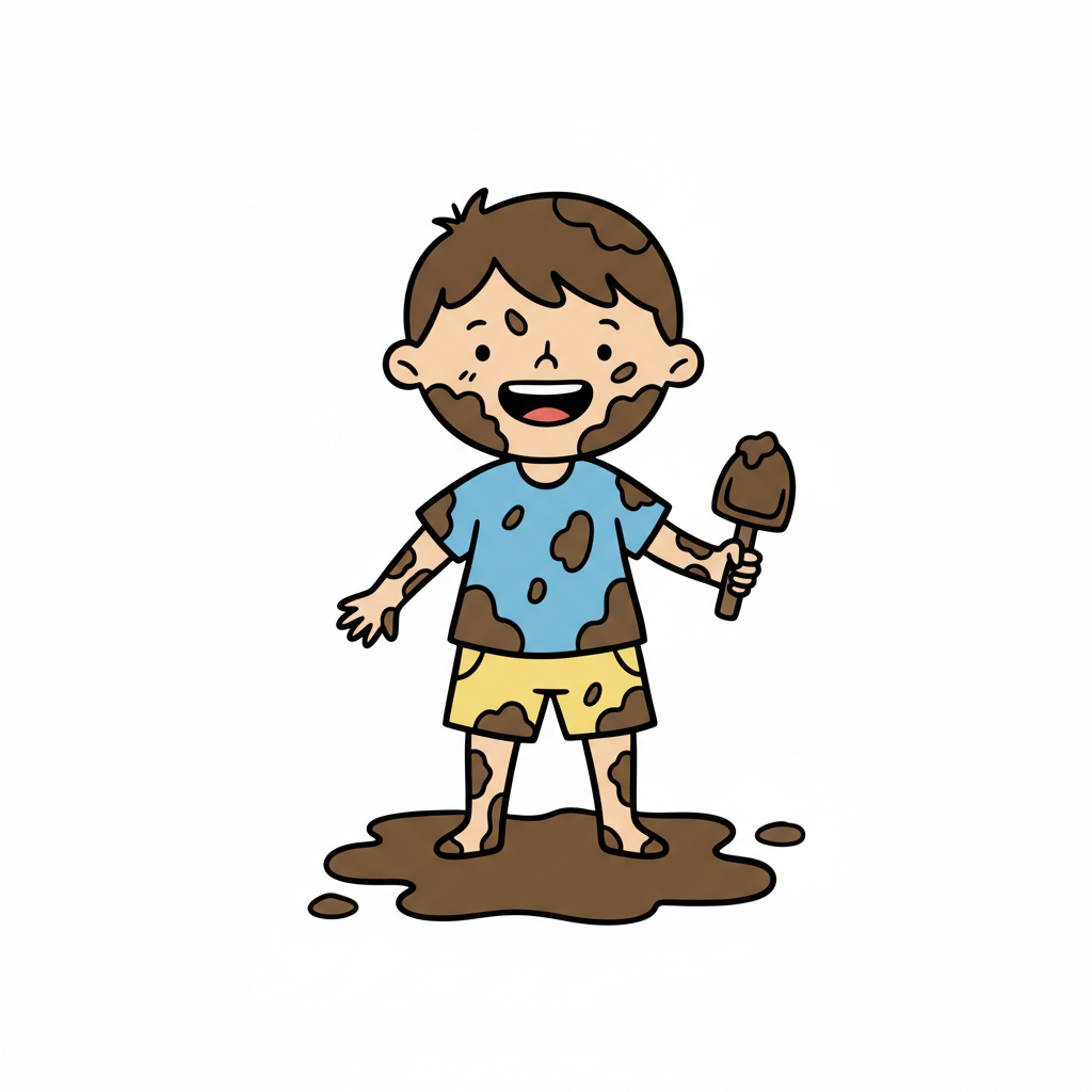 Ein fröhlicher Cartoon-Junge, ganz mit Schlamm bedeckt, hält einen schlammigen Ball.