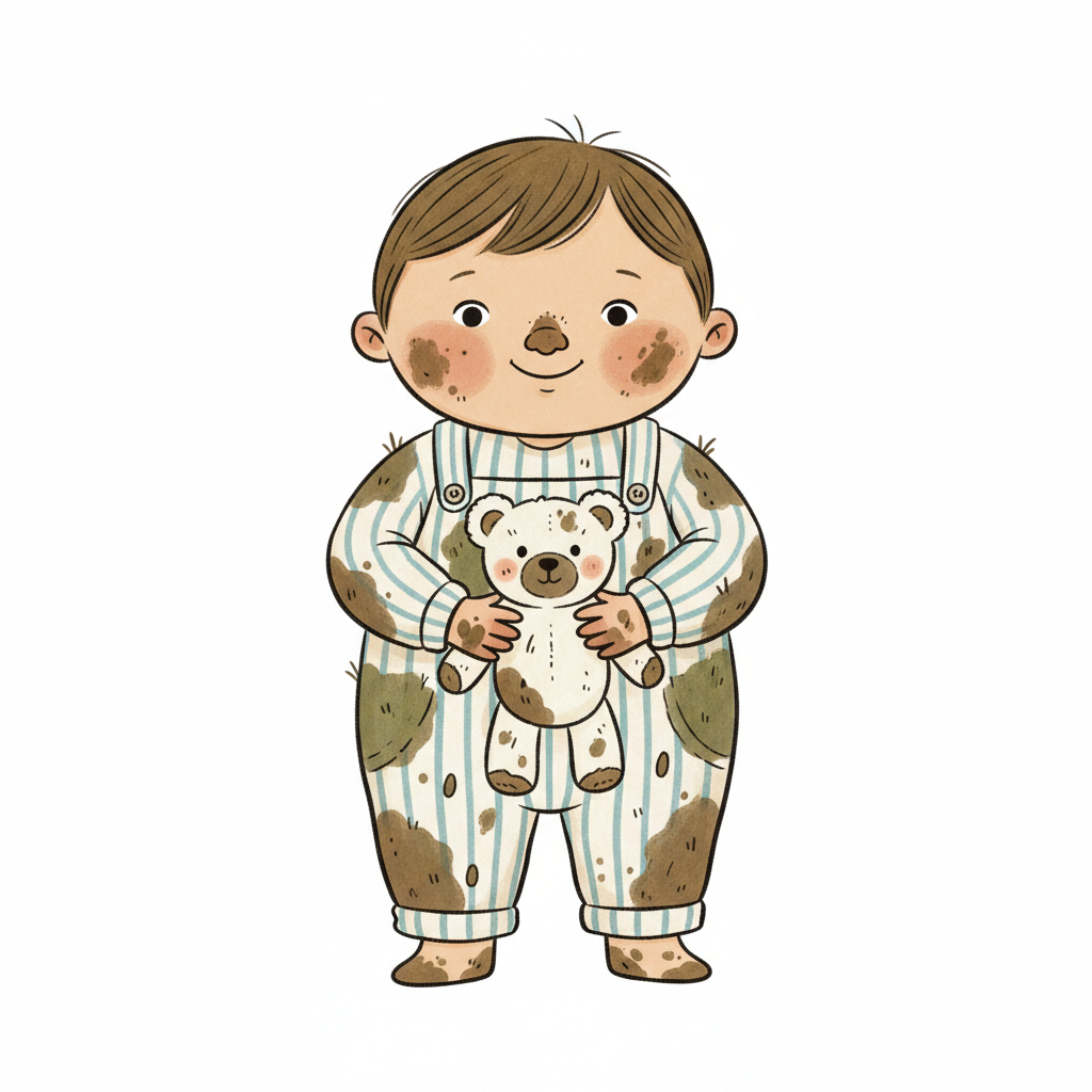 Niedliches Cartoon-Baby mit Schlammflecken und einem schmutzigen Teddybär in gestreiften Overalls.