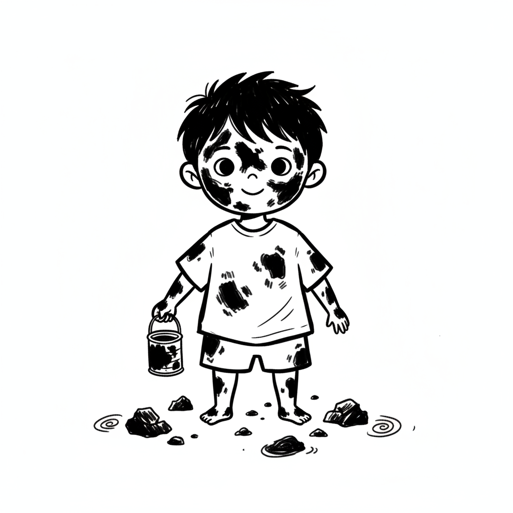 Schwarz-Weiß-Zeichnung eines schlammbedeckten Jungen mit Eimer, der glücklich lächelt.