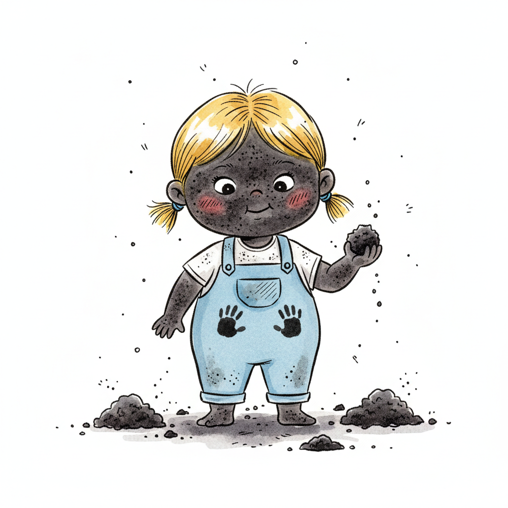 Fröhliches Cartoon-Mädchen, ganz mit Erde bedeckt, spielt mit Schlamm und hat Spaß.