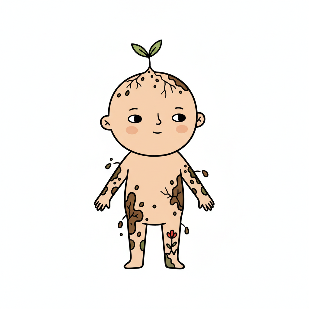 Ein schlammiges Cartoon-Kind mit einem Pflanzenkeim auf dem Kopf und einer Blume am Bein.