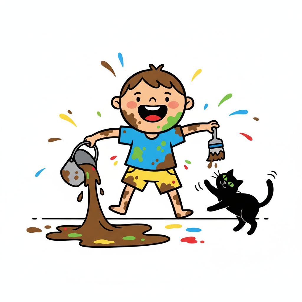 Ein fröhliches, schmutziges Kind und eine Katze spielen ausgelassen mit Farbe und Schlamm.
