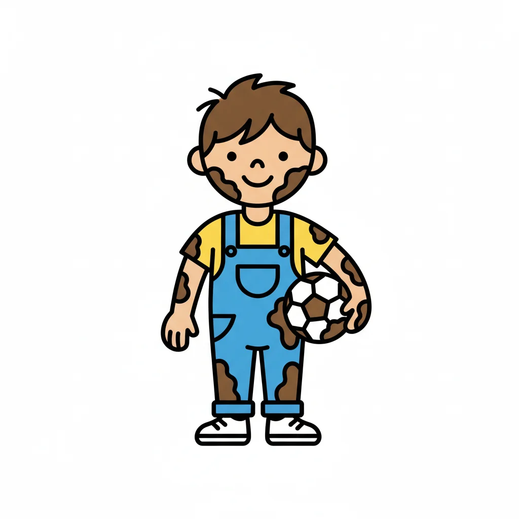 Ein fröhlicher Cartoon-Junge, bedeckt mit Schlamm, hält einen schlammigen Fußball.