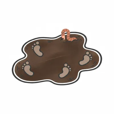 Ein Cartoon-Regenwurm schaut aus einer Schlammpfütze mit Fußabdrücken.