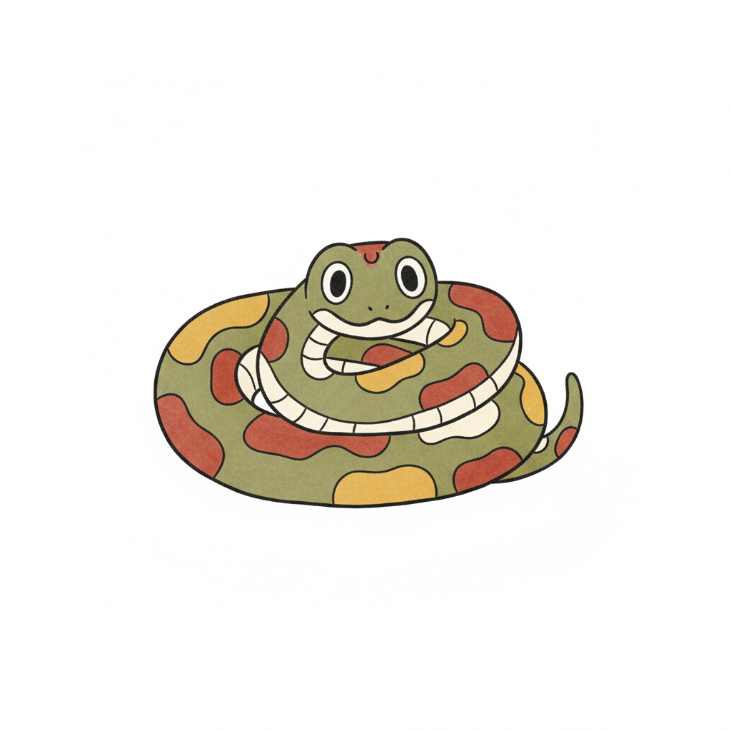 Eine cartoonhafte Schlange mit bunten Flecken und lächelndem Gesicht.