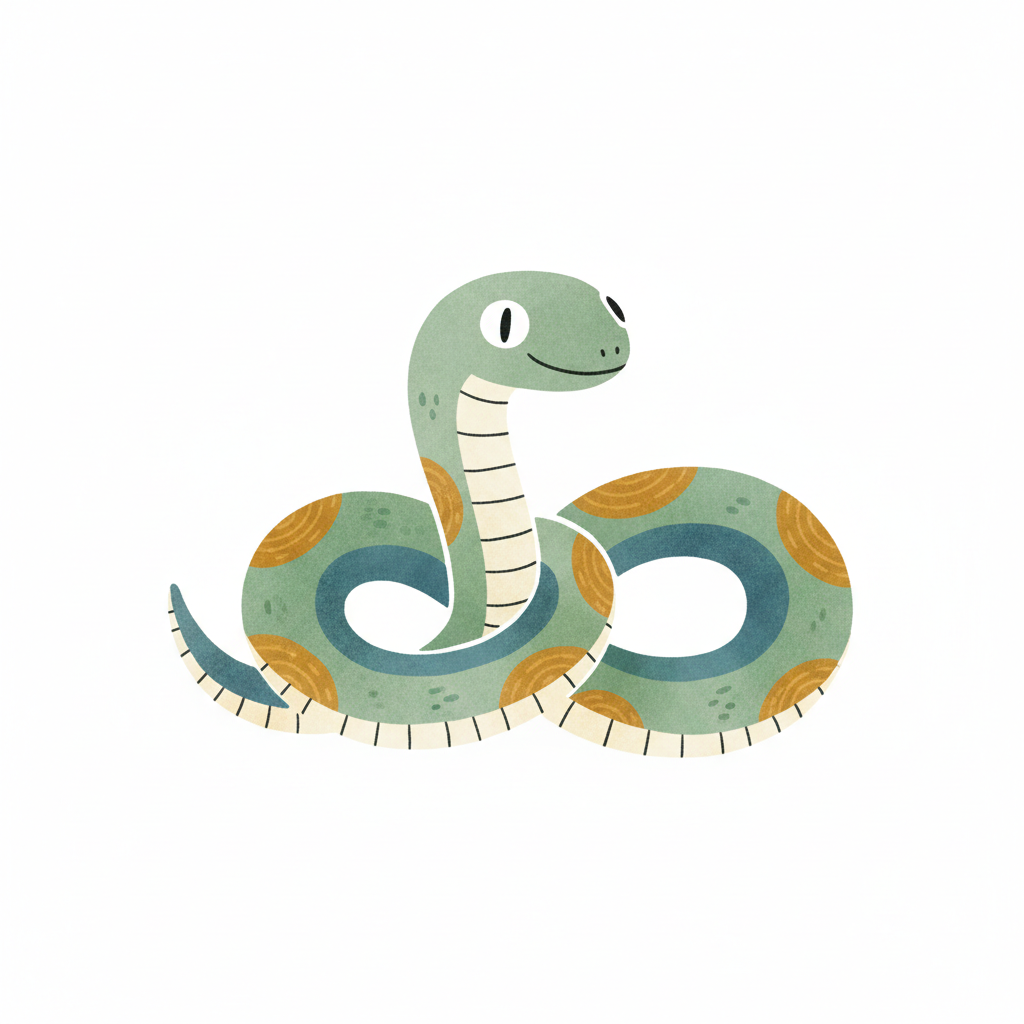 Eine bunte, cartoonhafte Schlange mit freundlichem Gesicht.