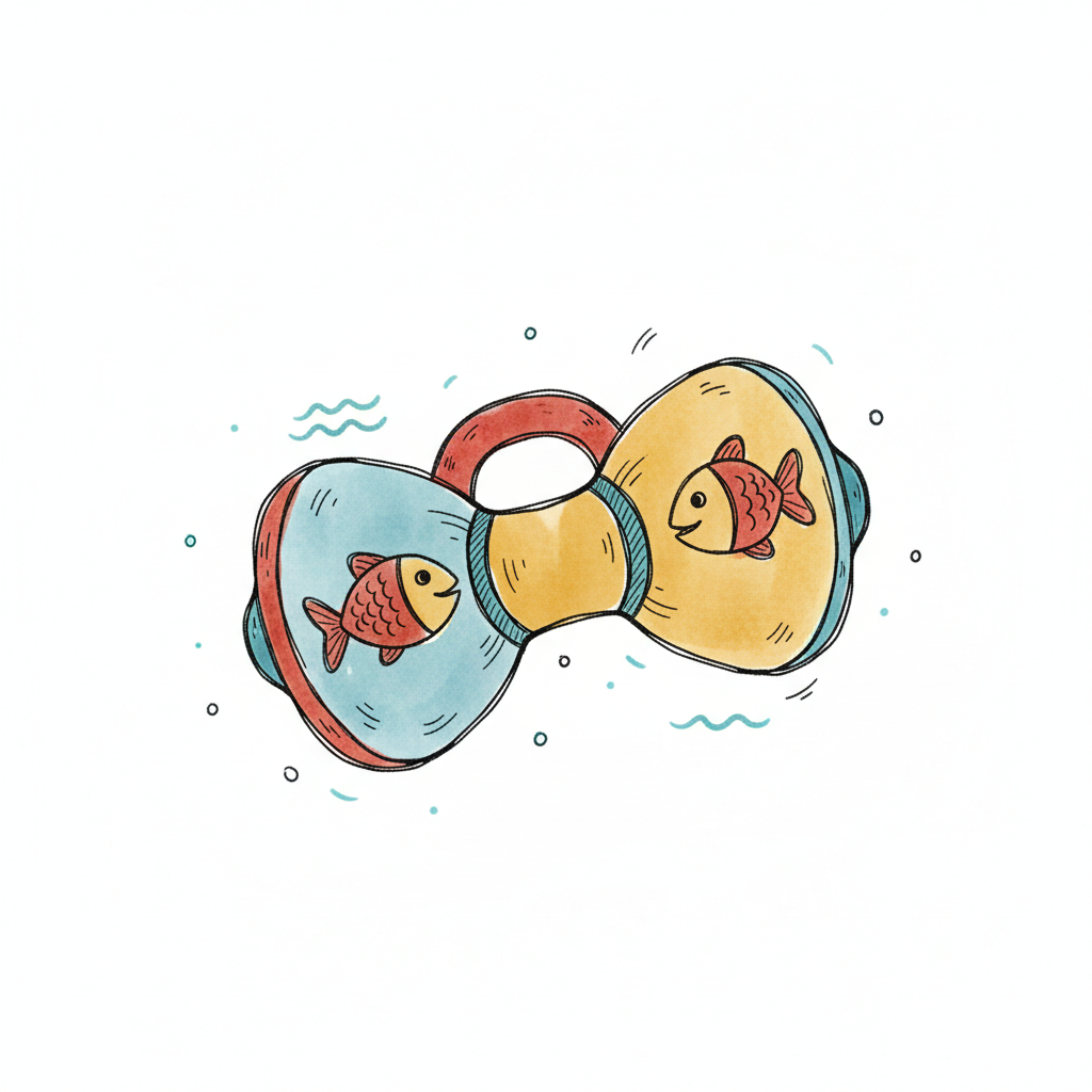 Illustration eines bunten Baby-Rassels in Schleifenform mit zwei Fischen und Wasserdetails.