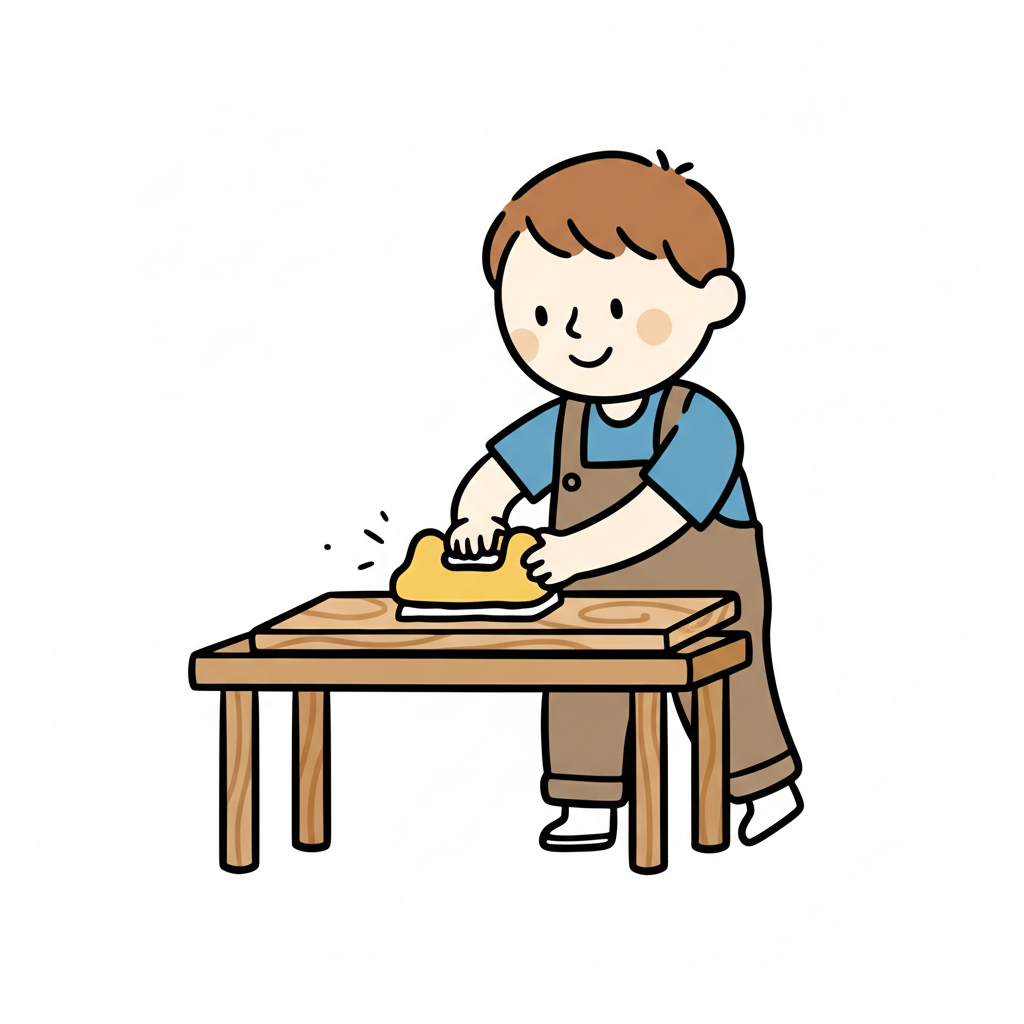 Ein Cartoon-Junge in Latzhose schleift Holz auf einem Tisch mit einem Schleifklotz.