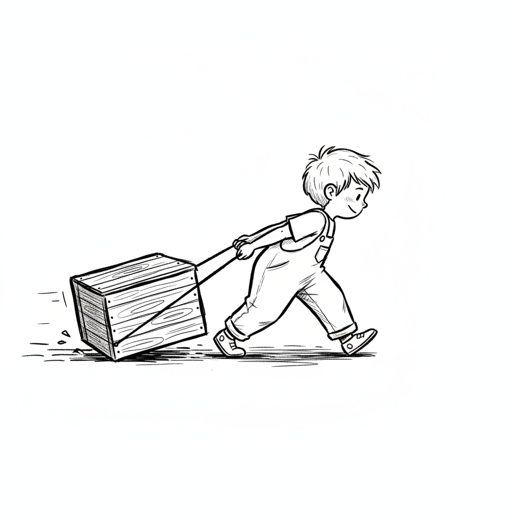 Ein lächelnder Junge in Latzhose zieht eine Holzkiste. Schwarz-weiß-Zeichnung.