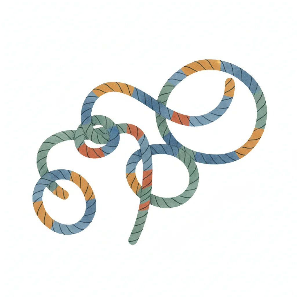 Illustration eines bunten, verwickelten Seils mit Knoten und Schleifen auf weißem Grund.