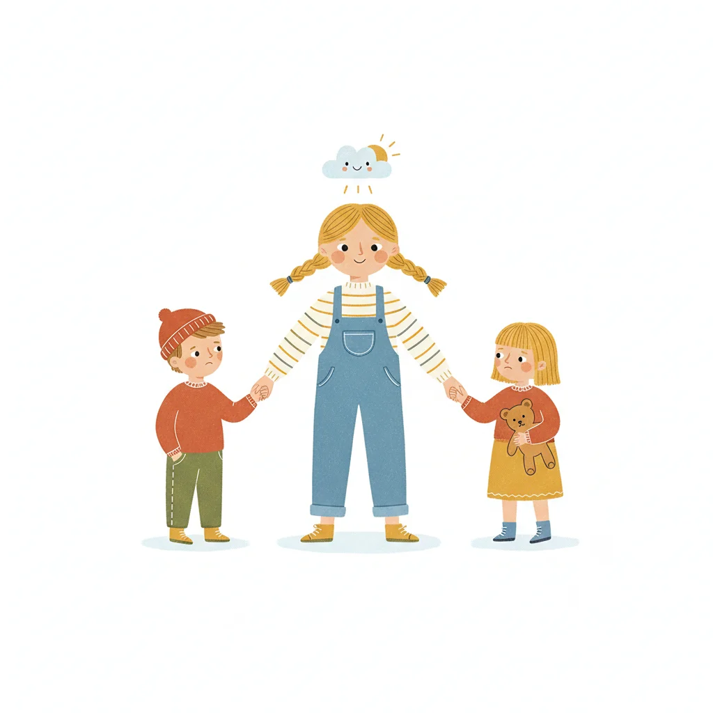 Illustration: Eine Frau/älteres Mädchen hält die Hände von zwei Kindern, über ihr eine lächelnde Wolke.