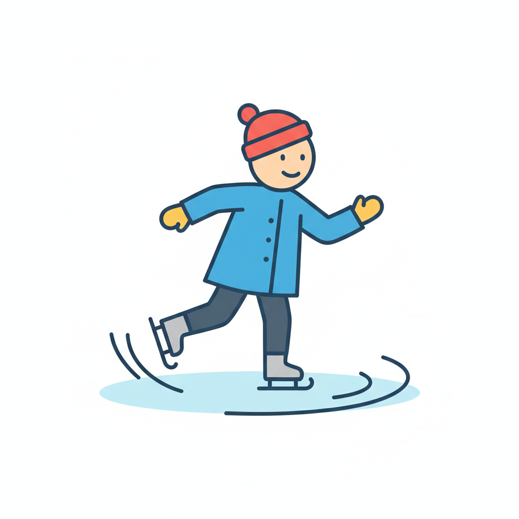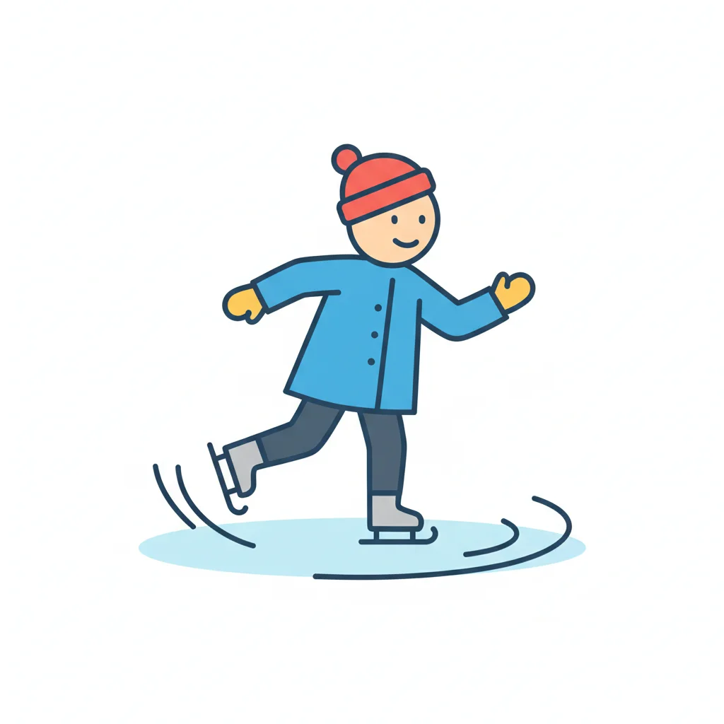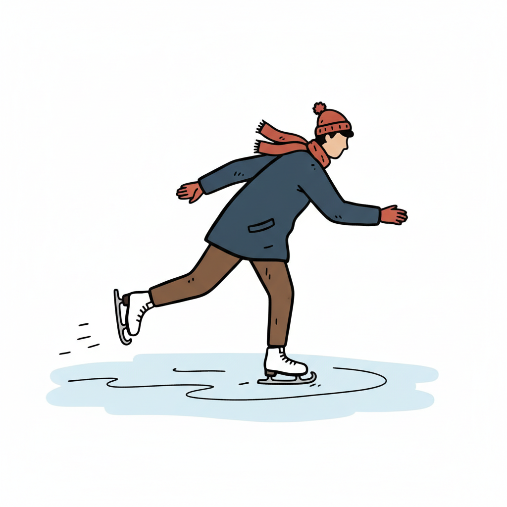 Cartoon-Darstellung einer Person in Winterkleidung beim Eislaufen auf einer Eisfläche.