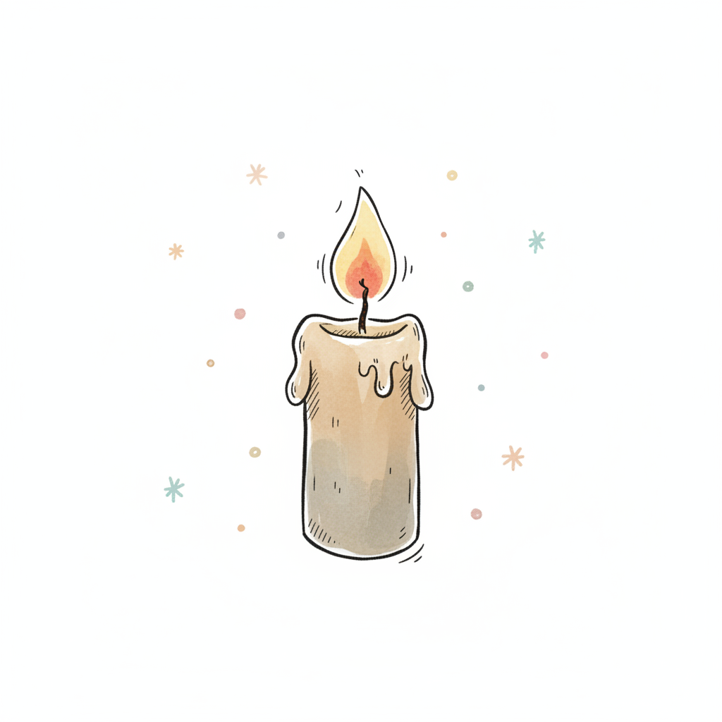 Niedliche Illustration einer brennenden Kerze mit schmelzendem Wachs und bunten Sternchen.