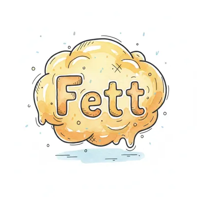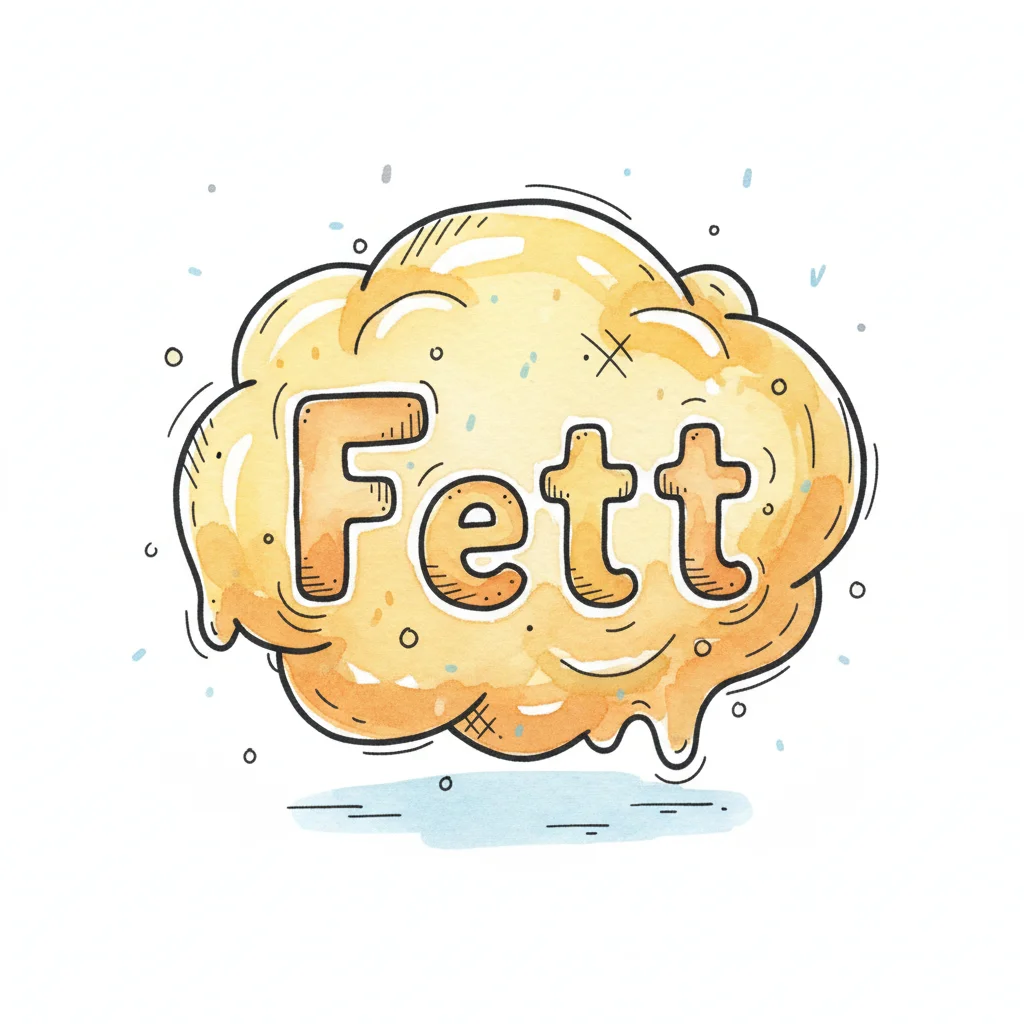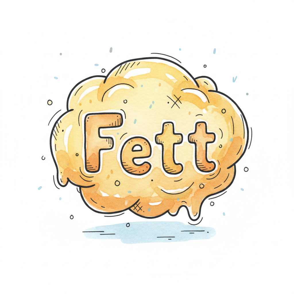 Illustriertes Wort "Fett" in einer gelben, schmelzenden Masse mit Cartoon-Stil.