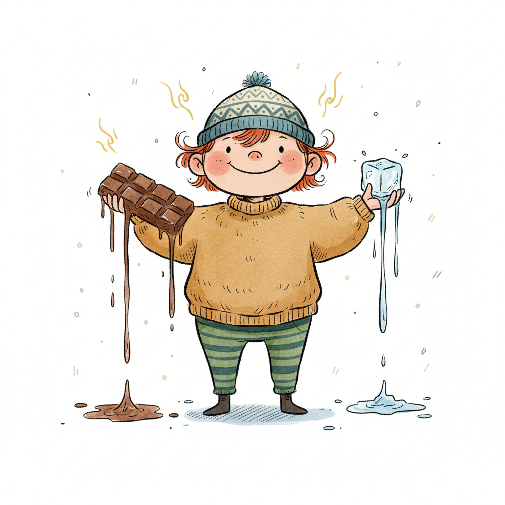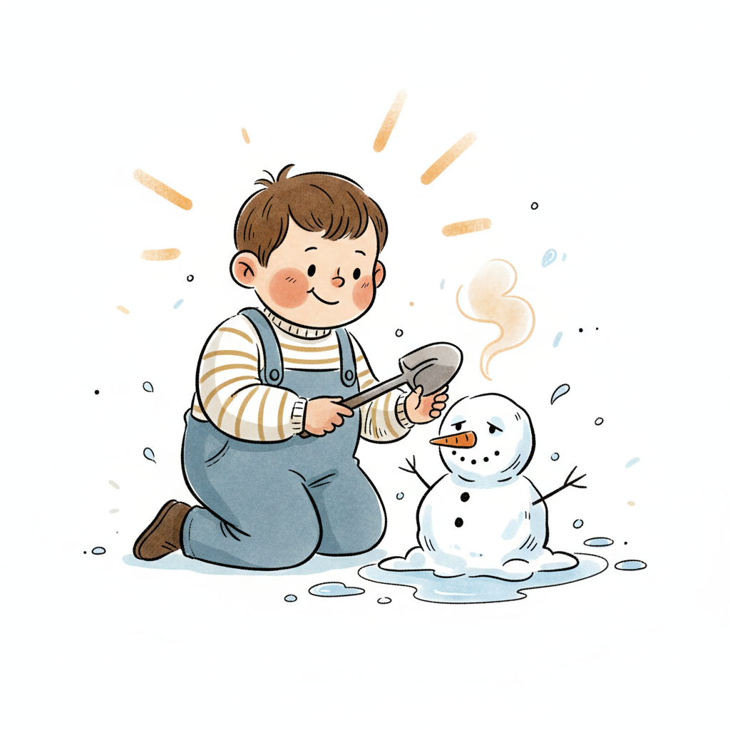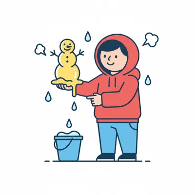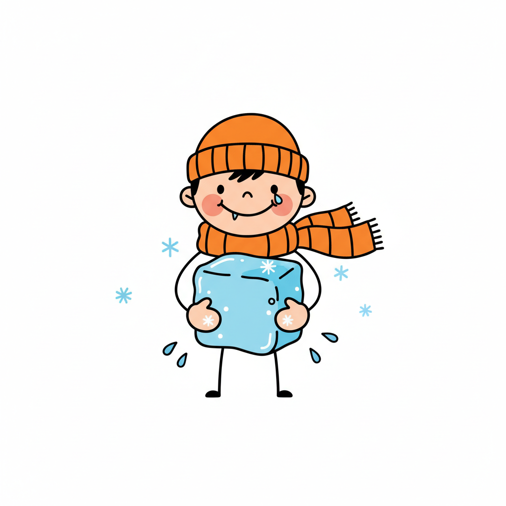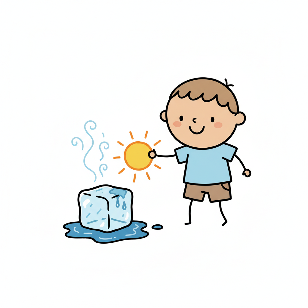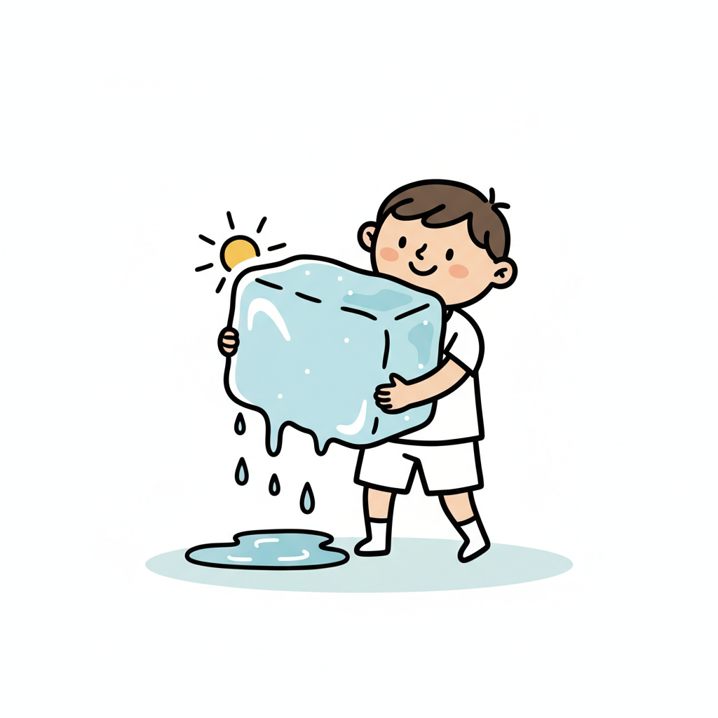 Ein Cartoon-Junge hält einen schmelzenden Eiswürfel unter der Sonne, Wasser tropft auf den Boden.