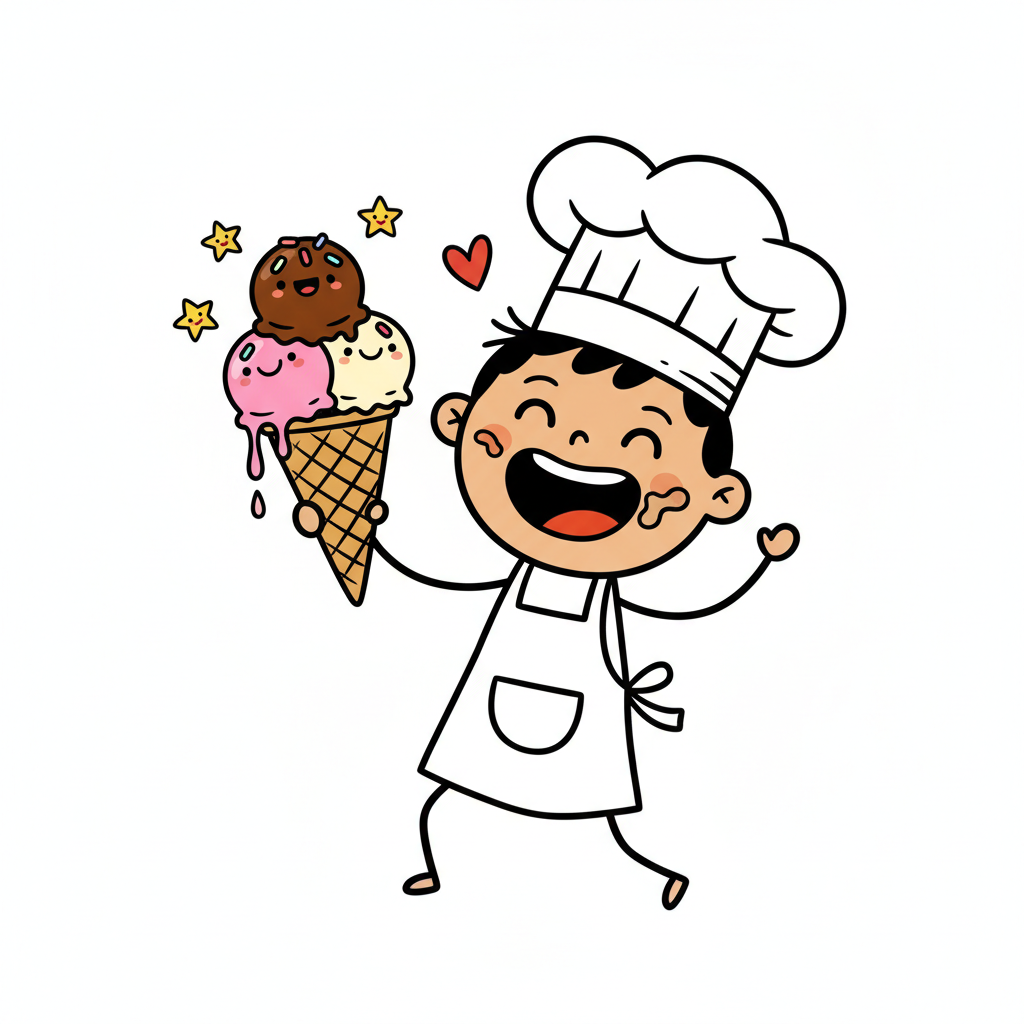 Fröhlicher Cartoon-Kochjunge mit schmelzendem dreifachem Eis in der Waffel.