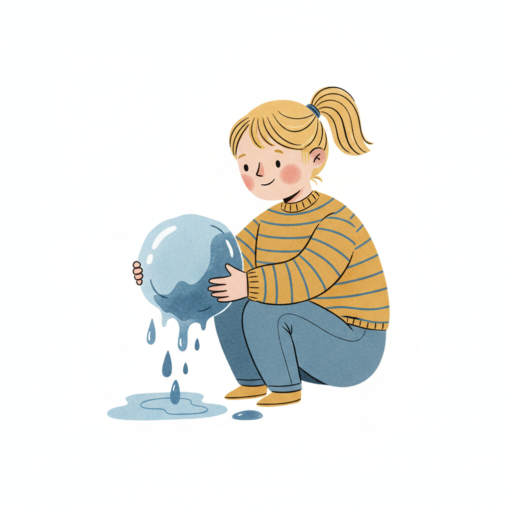 Ein Mädchen hockt und hält eine Kugel, aus der Wasser tropft und eine Pfütze bildet.
