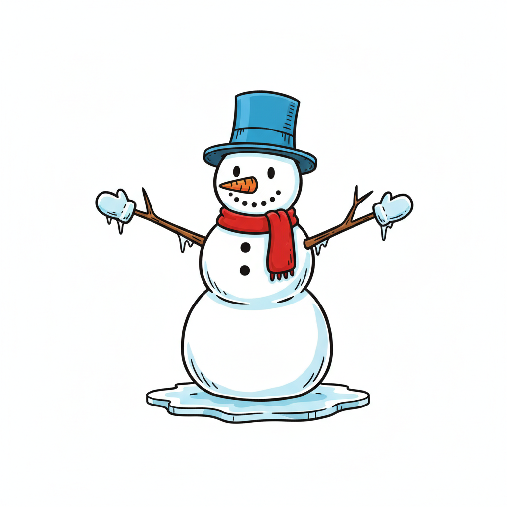 Niedlicher Schneemann mit blauem Hut und rotem Schal, der auf einer Pfütze schmilzt.