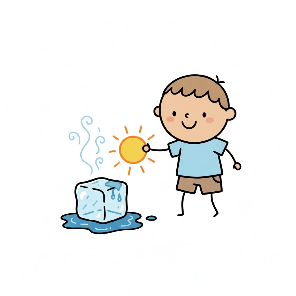 Ein Junge hält die Sonne, die einen schmelzenden Eiswürfel in Wasser und Dampf verwandelt.