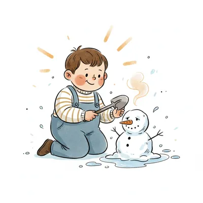 Kind kniet auf Eisscholle, lässt Wasser tropfen, umgeben von schmelzendem Eis, Blumen & Schneemännern.