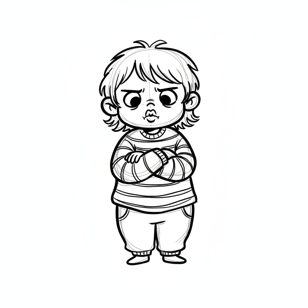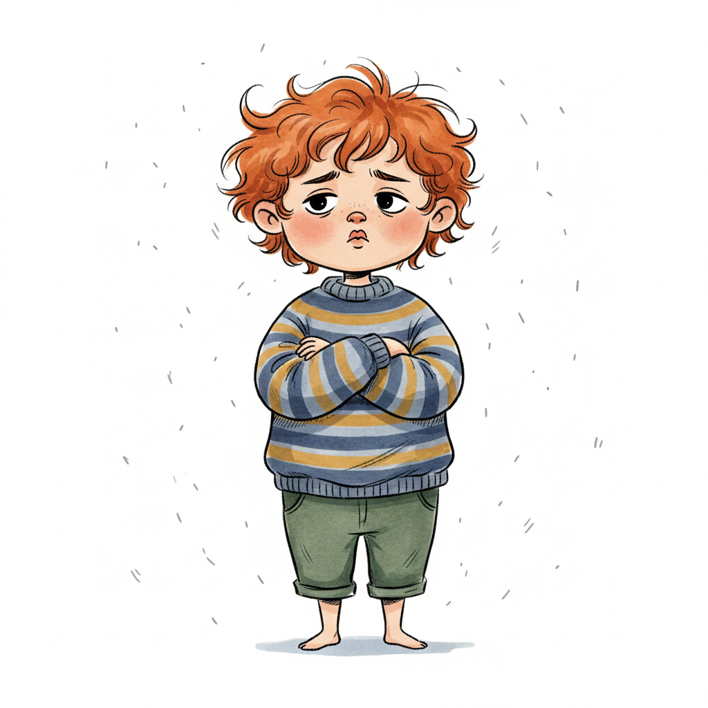 Ein unzufriedenes Kind mit verschränkten Armen in einem gestreiften Pullover.