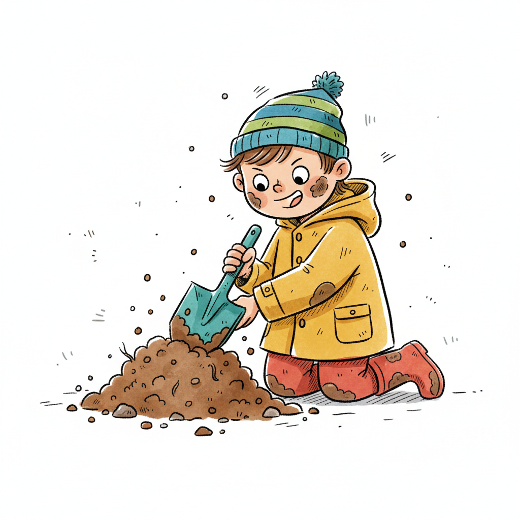 Ein fröhliches Kind mit Mütze und gelber Jacke gräbt mit einer Schaufel in der Erde und ist schmutzig.