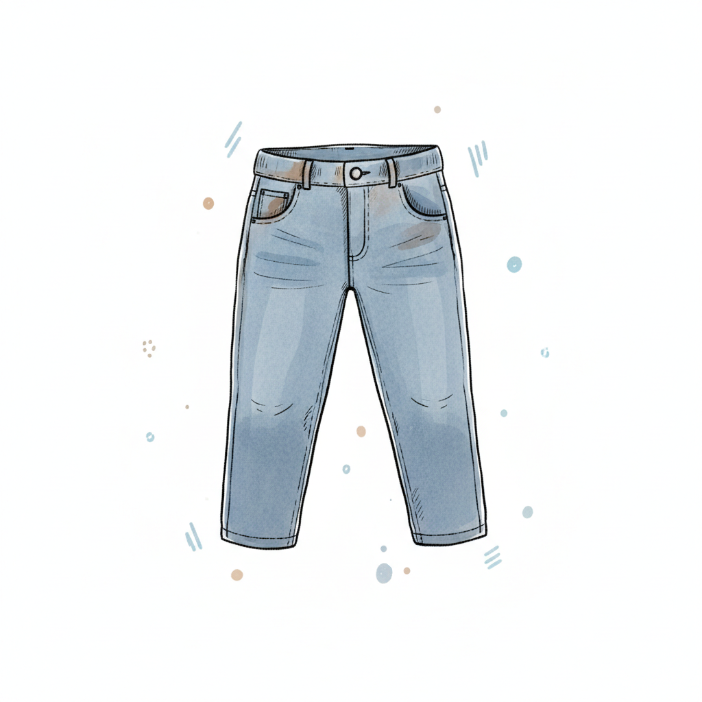 Cartoon-Illustration einer schmutzigen hellblauen Jeans auf weißem Hintergrund.
