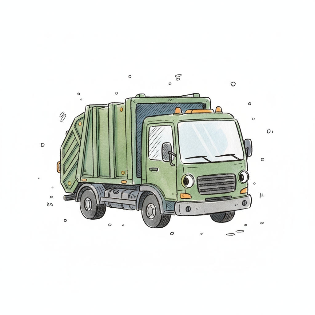 Freundlicher, grüner Cartoon-Müllwagen mit großen Augen und leichten Schmutzspuren, auf weißem Hintergrund.