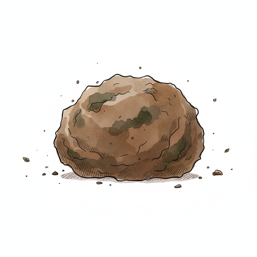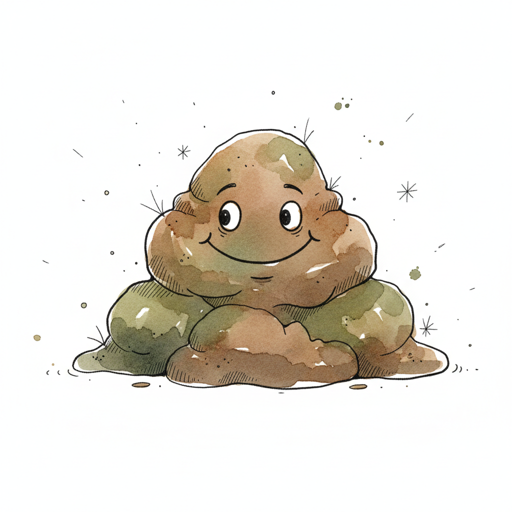 Eine lächelnde, braun-grüne Matschfigur im Aquarellstil mit glitzernden Details.