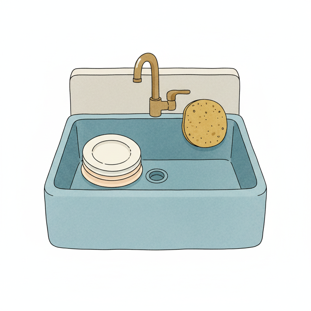 Ein Spülbecken mit schmutzigen Tellern und einem Schwamm, bereit zum Abwasch.