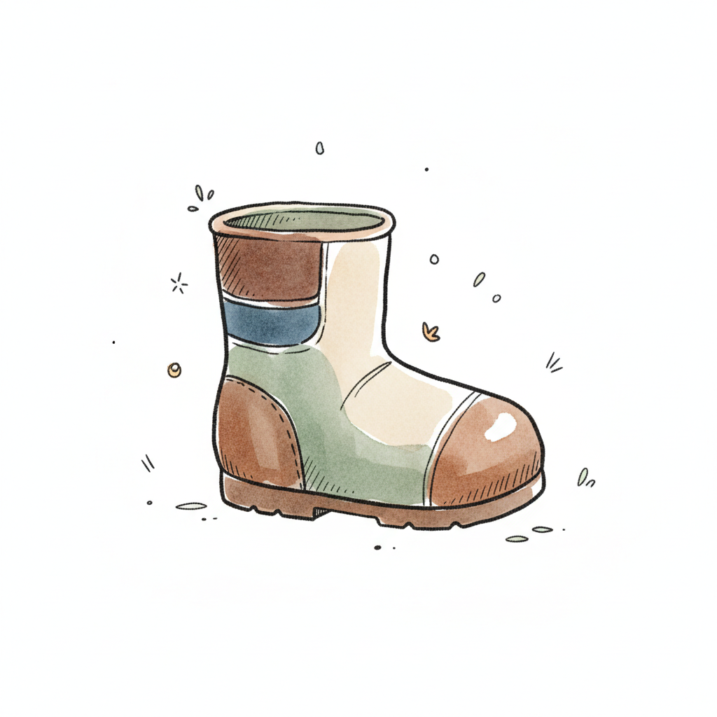Illustrierte braun-grüne Stiefel mit blauen Akzenten, umgeben von kleinen Blättern und Schmutz.
