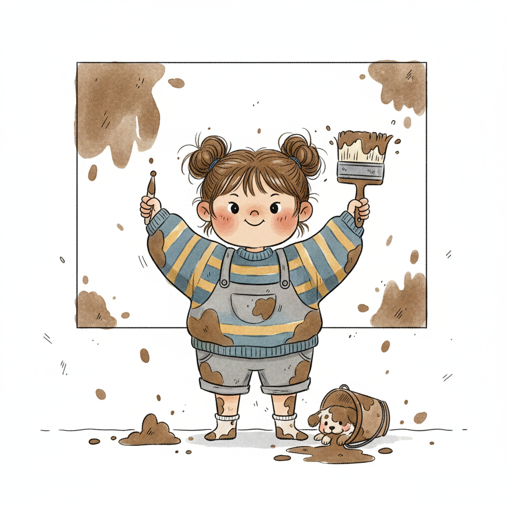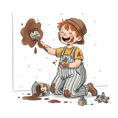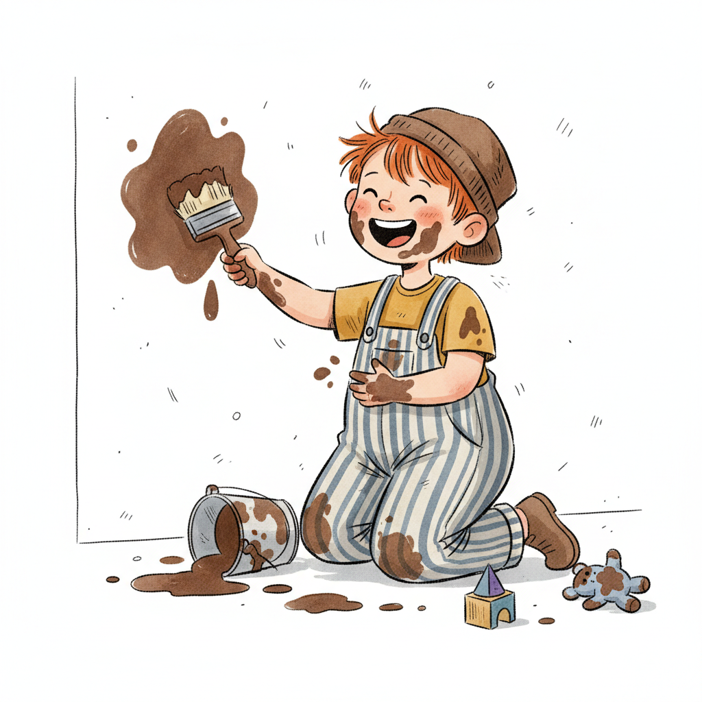 Ein fröhliches Kind malt mit brauner Farbe die Wand an, überall ist Schmutz und Chaos.