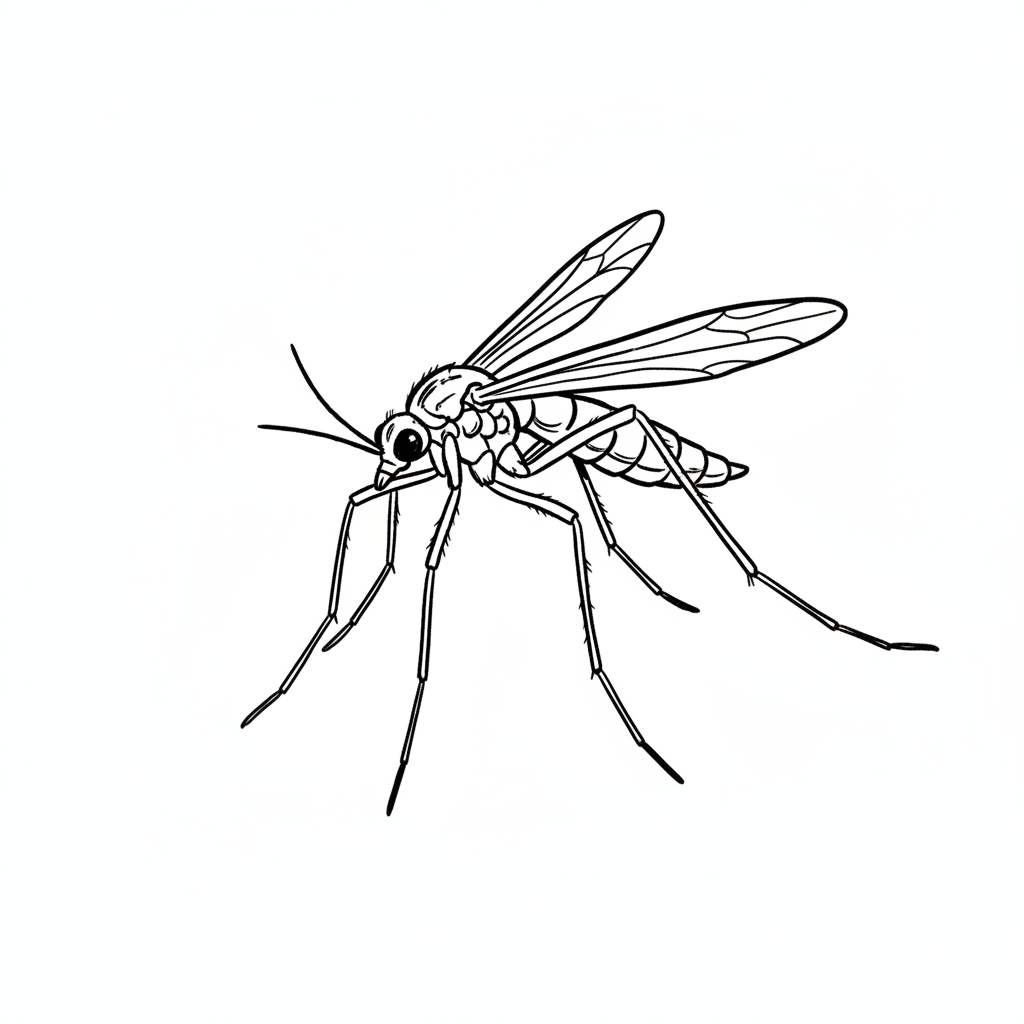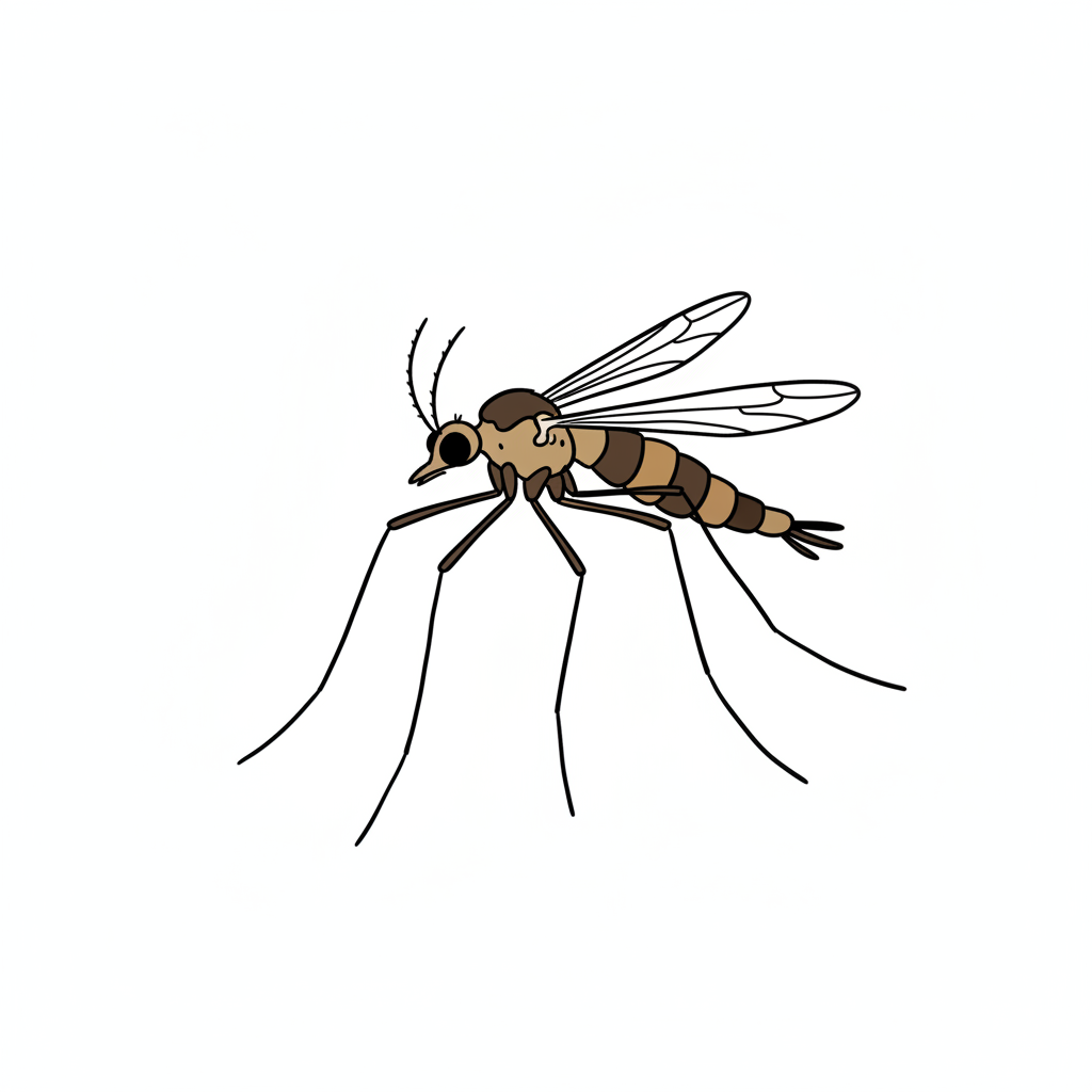 Eine stilisierte Zeichnung einer Mücke mit detaillierten Eigenschaften.