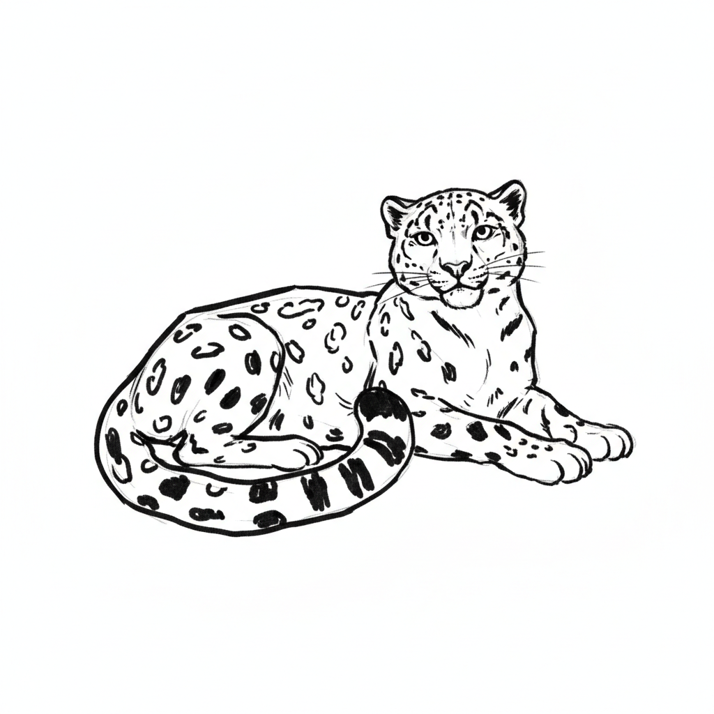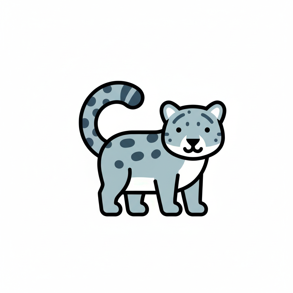 Ein gezeichneter Schneeleopard mit Flecken auf weißem Hintergrund.