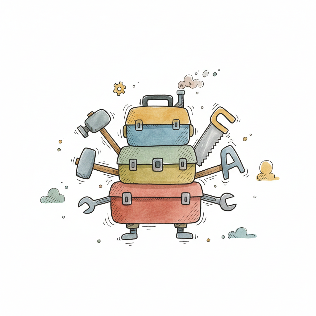 Bunter Roboter aus gestapelten Werkzeugkästen mit Hämmern, Säge und Schraubenschlüsseln.