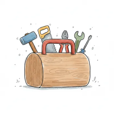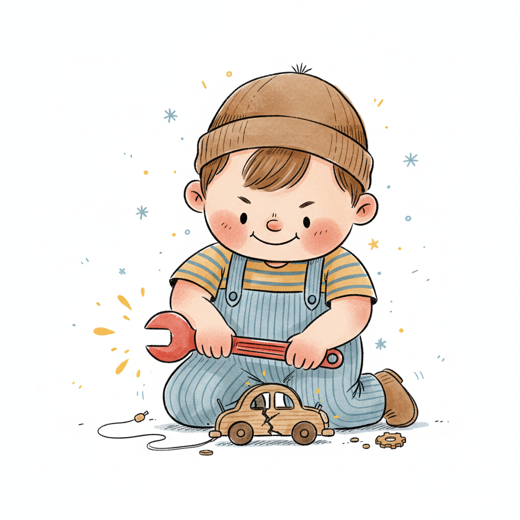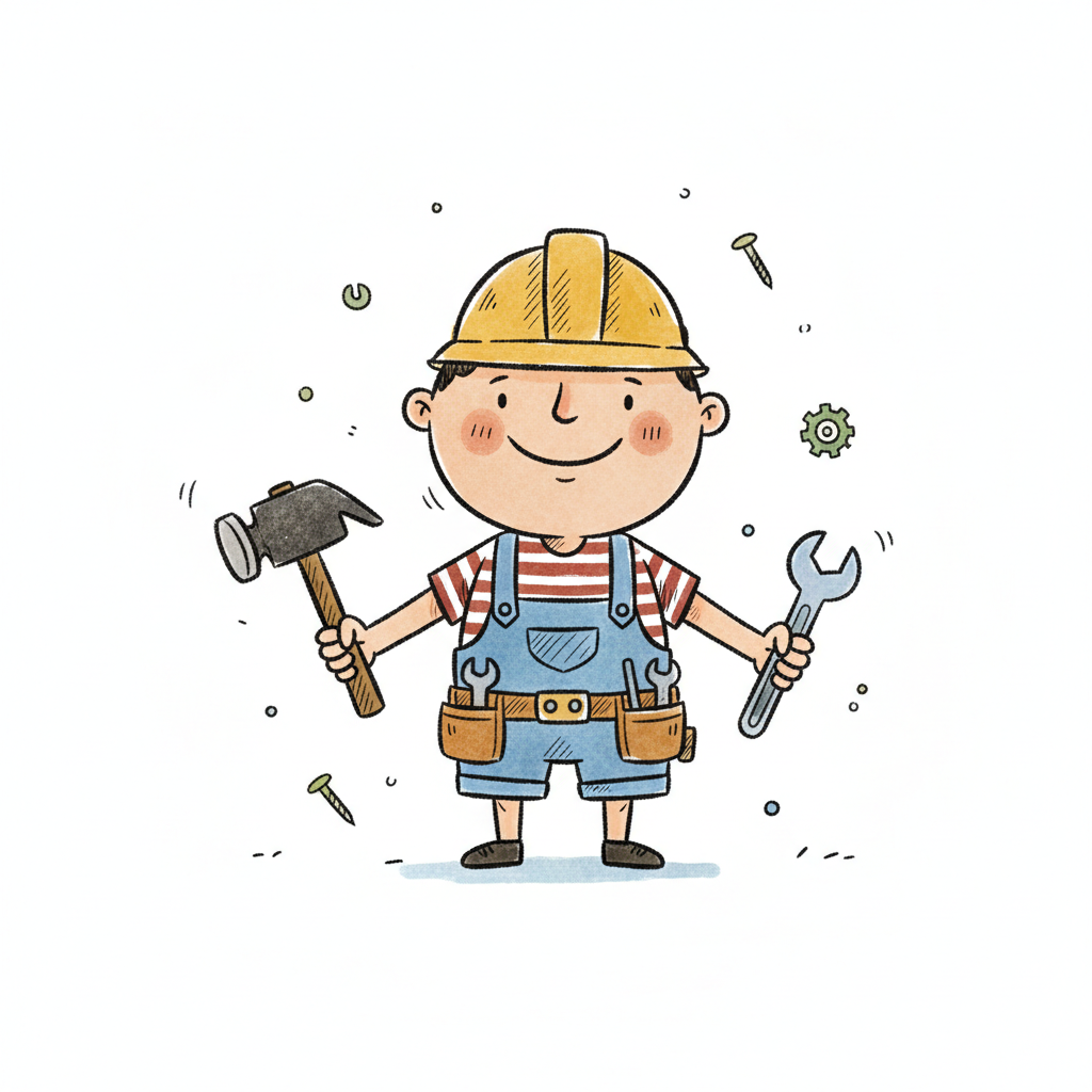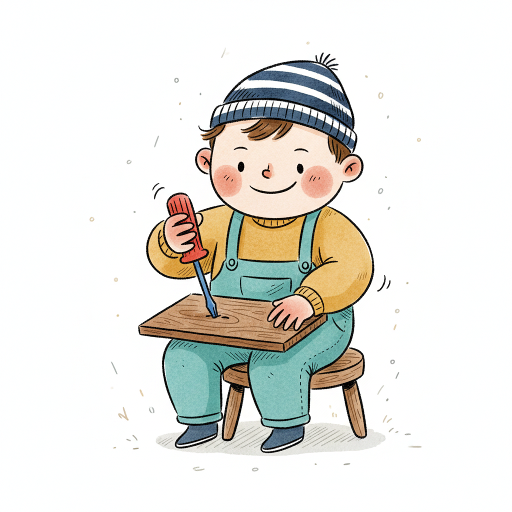 Ein lächelnder Cartoon-Junge in Latzhose und Mütze schraubt in ein Holzstück.