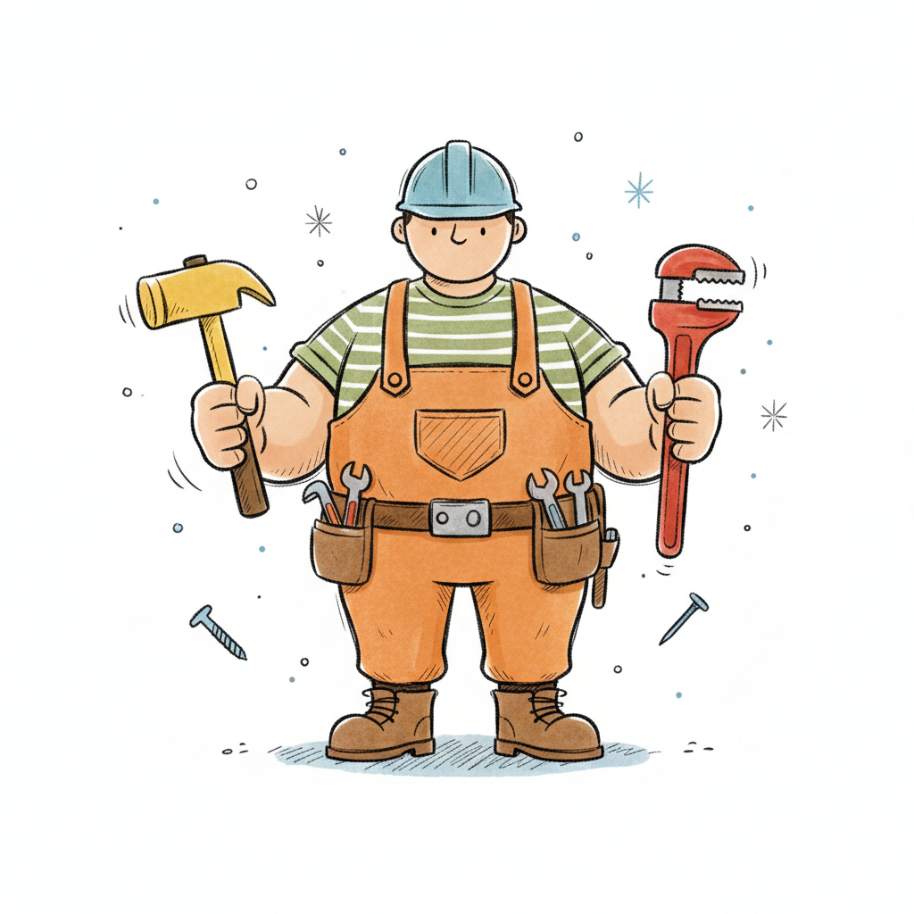 Lustiger Cartoon-Handwerker mit Helm, Latzhose, Hammer, Schraubenschlüssel und Werkzeuggürtel.