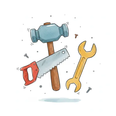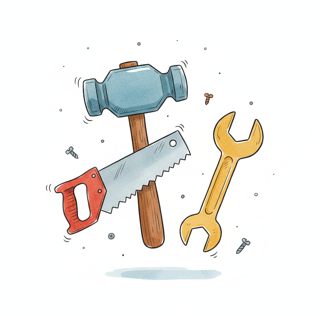 Bunte Illustration von schwebenden Werkzeugen: Hammer, Säge, Schraubenschlüssel und Schrauben.