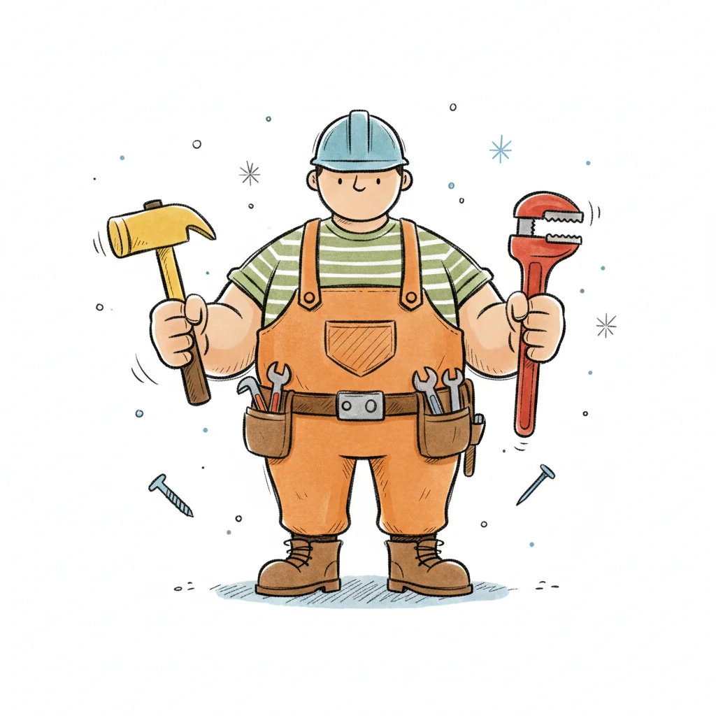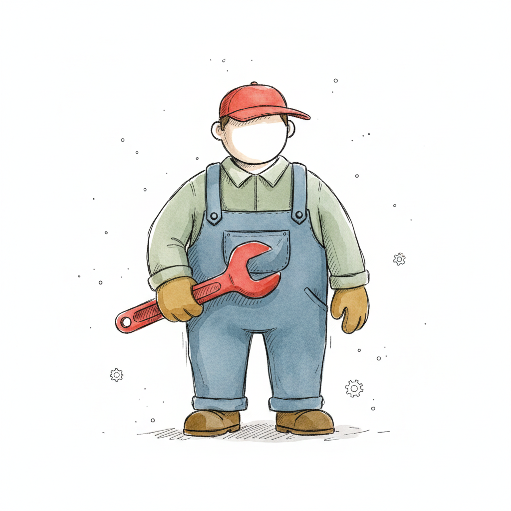Illustration eines Mechanikers in Latzhose mit rotem Schraubenschlüssel und leerem Gesicht.