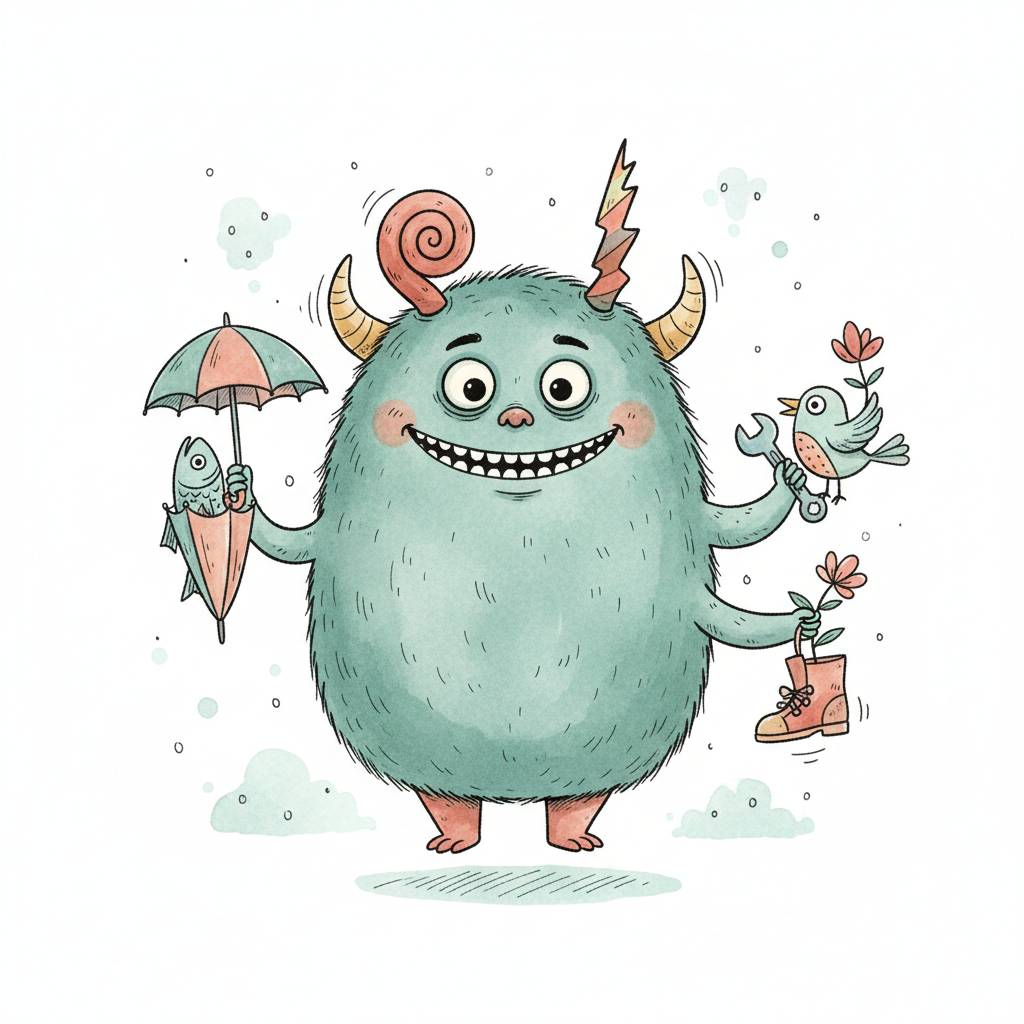 Ein flauschiges, lächelndes Monster mit Regenschirm-Fisch, Vogel-Schraubenschlüssel und Blumen-Stiefel.