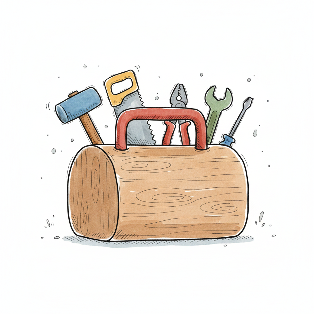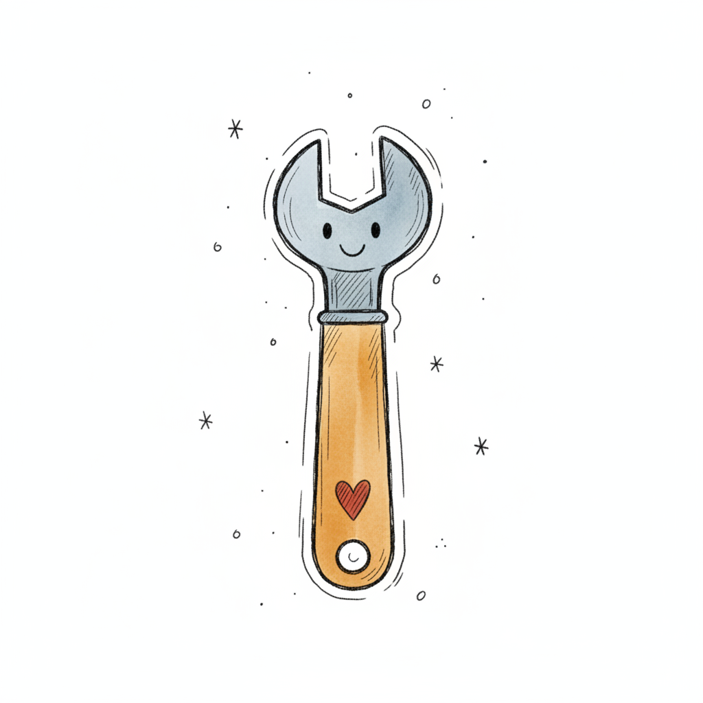 Fröhlicher Cartoon-Schraubenschlüssel mit lächelndem Gesicht und Herz auf dem Holzgriff.