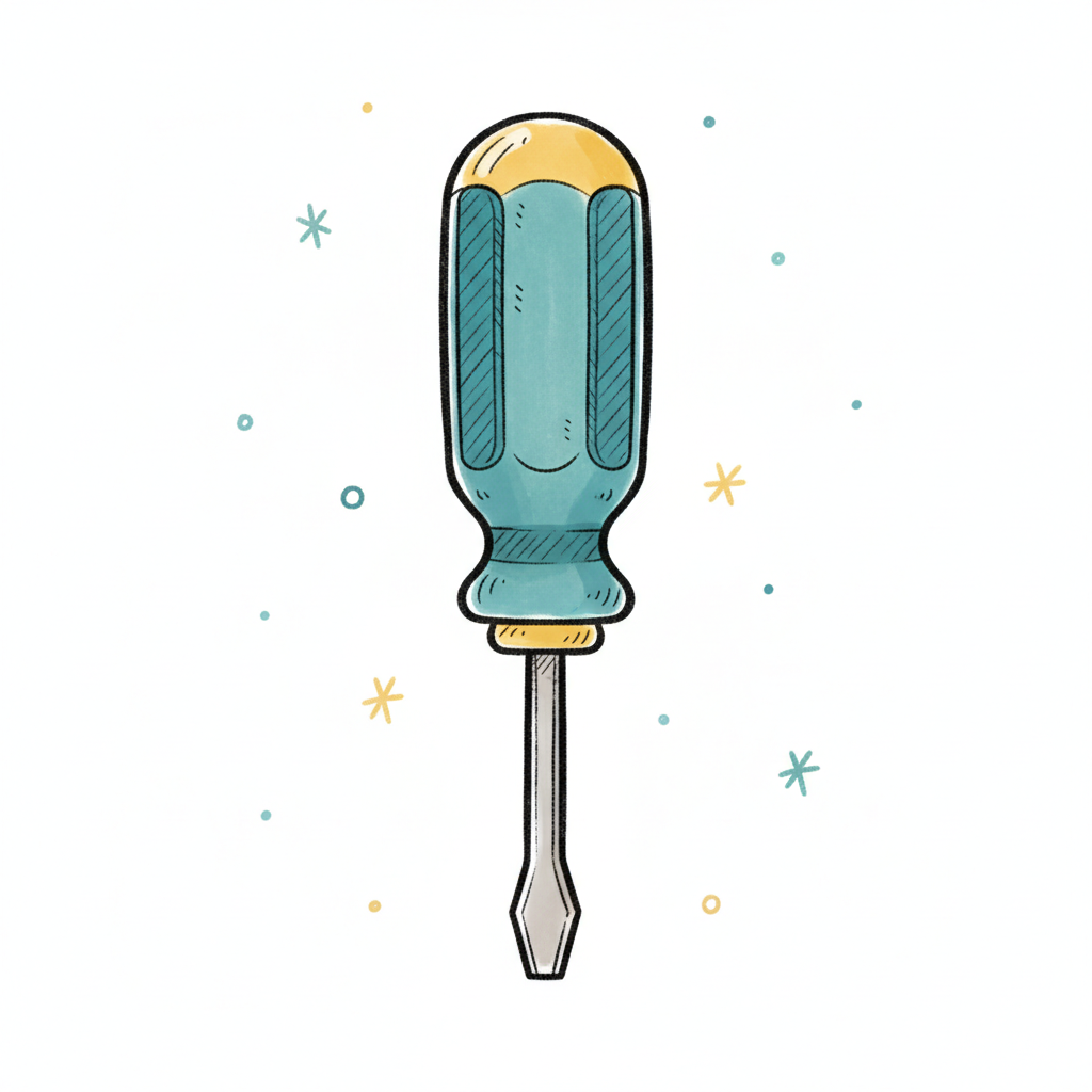 Illustrierter Schraubendreher mit blauem Griff und gelber Kappe, umgeben von bunten Punkten.