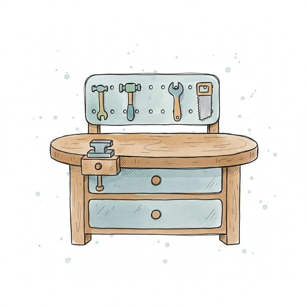 Niedliche, illustrierte Werkbank mit Hämmern, Schraubenschlüssel, Säge und Schraubstock.