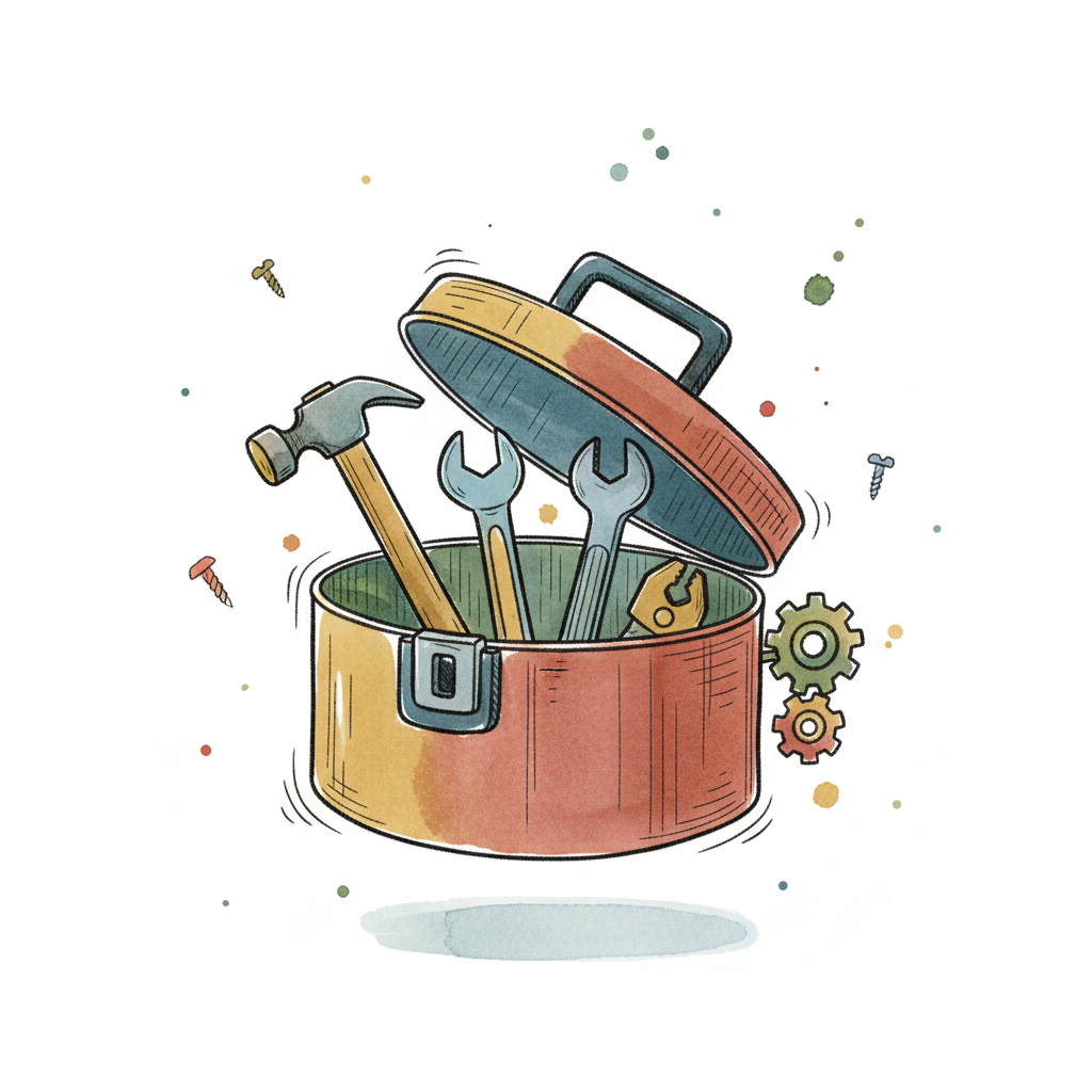 Bunte Aquarell-Illustration eines geöffneten Werkzeugkastens mit Hammer, Schraubenschlüsseln, Schrauben und Zahnrädern.
