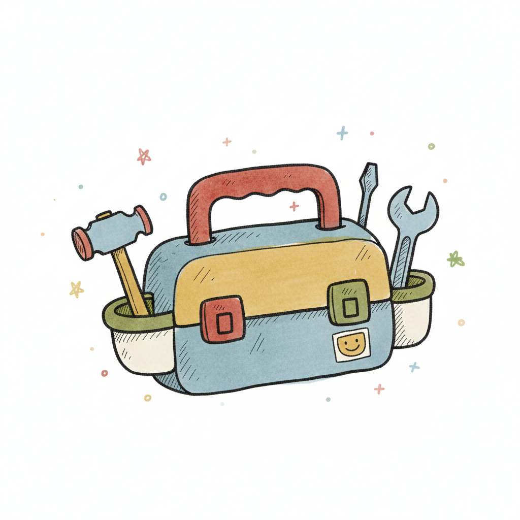 Bunte Cartoon-Werkzeugkiste mit Hammer, Schraubenzieher und Schraubenschlüssel, auf weißem Hintergrund.