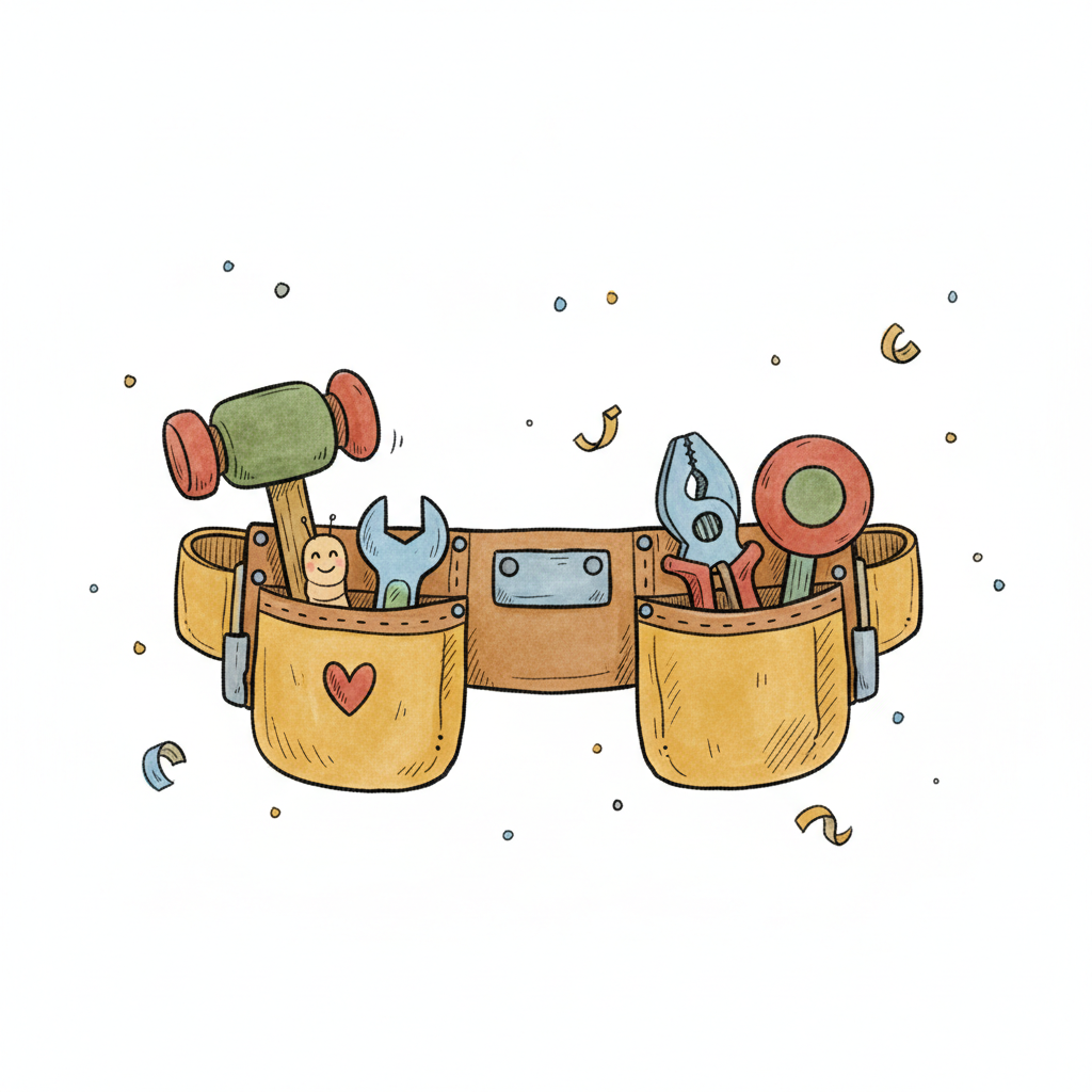 Bunter Cartoon-Werkzeuggürtel mit Hammer, Zange, Schraubenschlüssel und einem süßen Wurm.