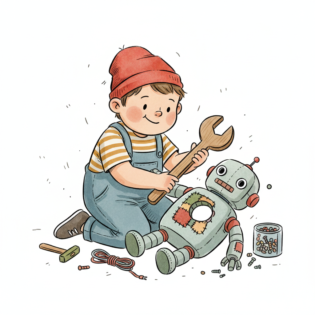 Ein Junge repariert lächelnd einen Spielzeugroboter mit einem großen Schraubenschlüssel.