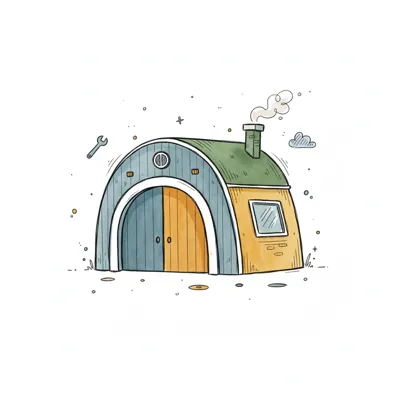 Farbenfrohes, rundes Werkstatt-Häuschen im Cartoon-Stil mit Schornstein und Schraubenschlüssel.