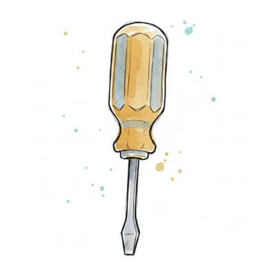Aquarell-Illustration eines gelben Schlitzschraubenziehers mit Farbspritzern auf weißem Hintergrund.